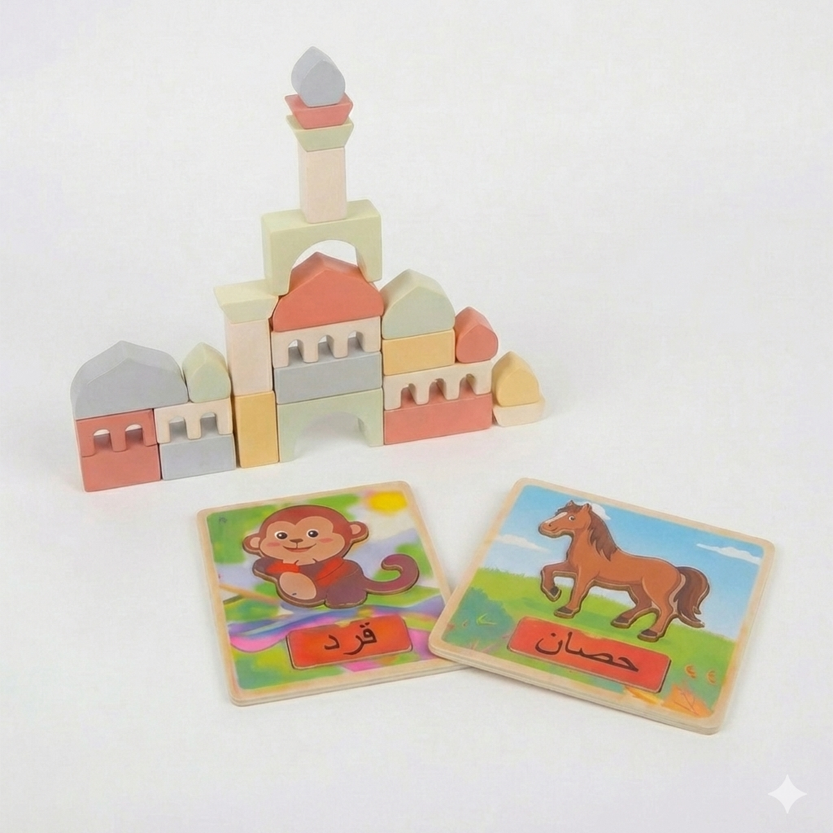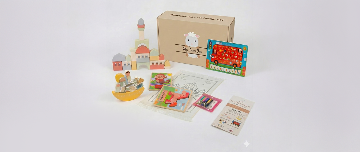 Every two months you will receive a box that includes 4 - 5 high quality Montessori-inspired toys designed to nurture your child’s growth through Islamic values and hands-on learning. Each box will cover four different categories of development, as shown in the sample box below.